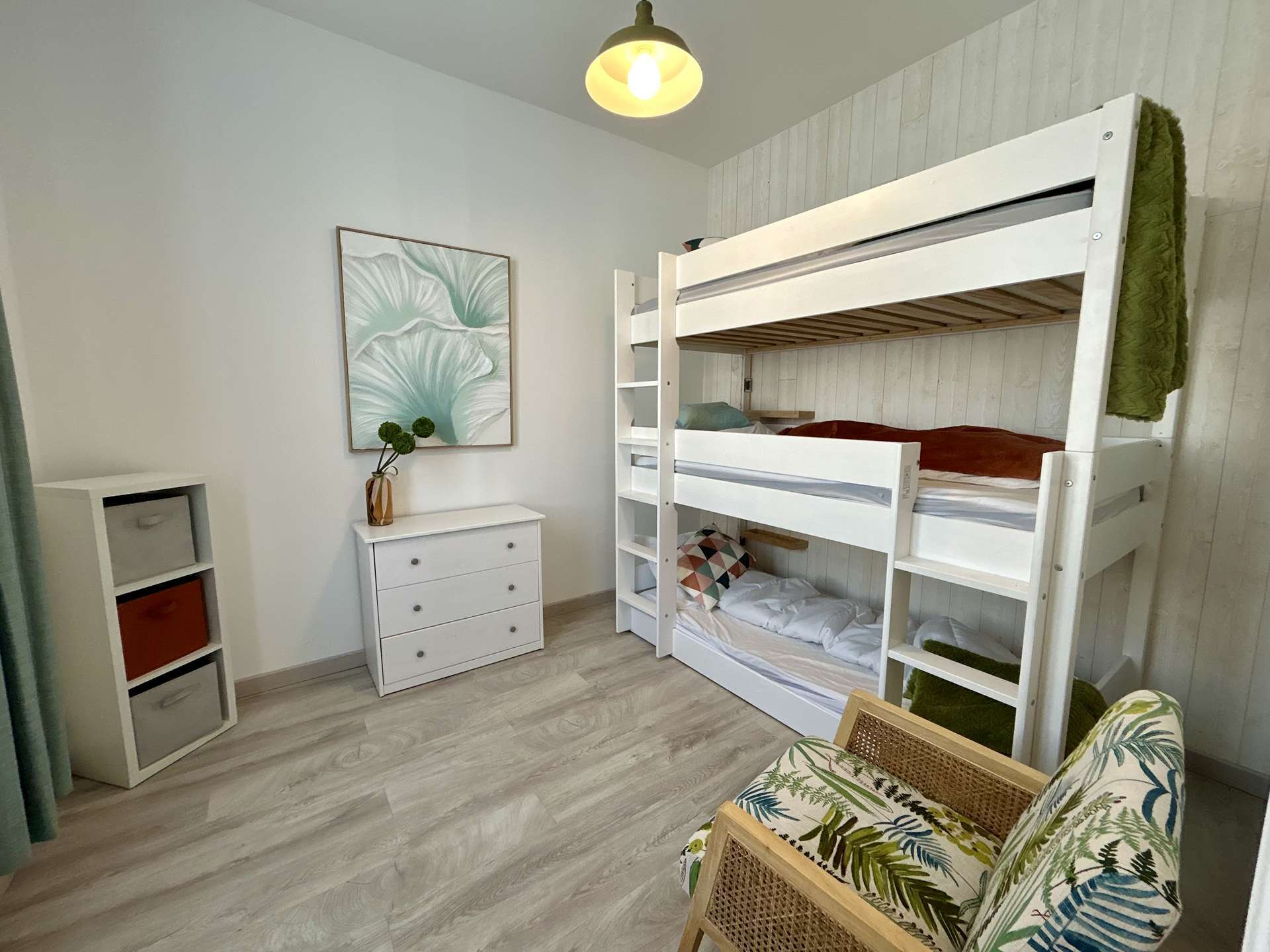 Sie finden dort insbesondere eine voll ausgestattete Küche, einen Elektrogrill zum Genießen von Mahlzeiten im Freien, eine leistungsstarke WLAN-Verbindung und einen hellen und freundlichen Wohnbereich. Der Schlafbereich besteht aus einem Hauptschlafzimmer mit einem 160 cm breiten Doppelbett und einem zweiten Schlafzimmer mit drei 80 cm breiten Etagenbetten, ideal für Kinder.