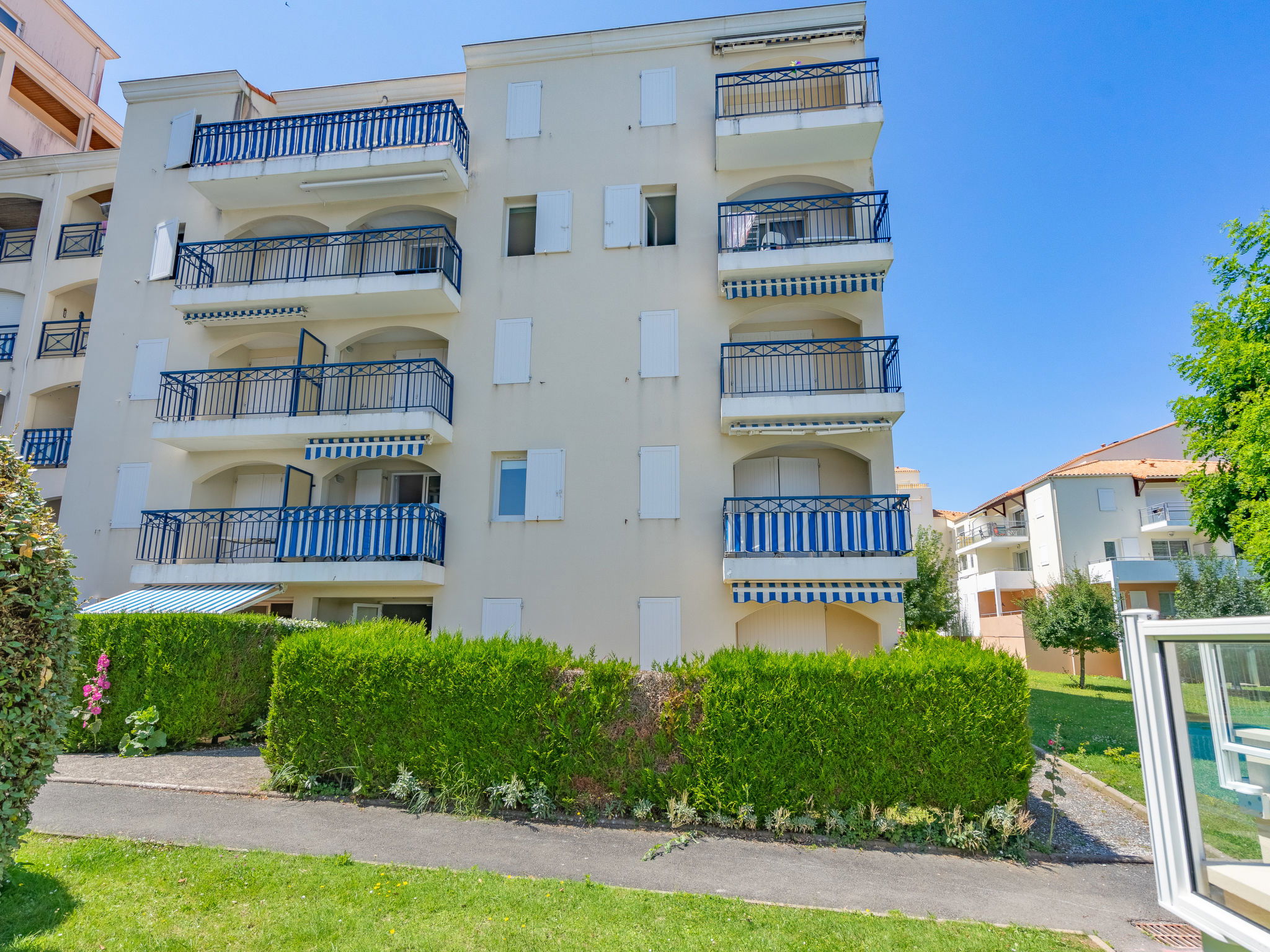 Vaux sur Mer 2 km von Royan: Grosse Residenz "Parc de Pontaillac", auf 4 Stockwerken. 215 Wohnungen in der Residenz. Im Ortsteil Pontaillac, 2 km vom Zentrum von Vaux sur Mer, 2.3 km vom Zentrum von Royan, belebte Lage in einem Wohnquartier, 200 m vom Meer, 200 m vom Strand. Zur Mitbenutzung: Schwimmbad eckig eingezäunt (15 x 7 m, saisonale Verfügbarkeit: 01.Jul. - 31.Aug.). Im Hause: Fahrstuhl, Einstellraum für Fahrräder. Öffentliche Parkplätze auf der Strasse. Einkaufsgeschäft 200 m, Supermarkt 1.4 km, Restaurant, Bar, Bäckerei, Café 200 m, Bushaltestelle "Porte Océane" 100 m, Bahnstation "Royan" 3.2 km, Sandstrand "Pontaillac" 200 m, Park "Luna Park (Juillet-Août)" 17 km, Hallenbad 3 km, Thermalbad "Thalassothérapie Thalazur Royan" 1.7 km, See Métairie - Royan 1.5 km. Sporthafen 2.4 km, Golfplatz (18 Loch) 5.5 km, Surfschule 200 m, Segelschule 2.5 km, Tennis 2 km, Tennishalle 2 km, Minigolf 550 m, Reitstall 6 km, Radweg 100 m. Nahe gelegene Sehenswürdigkeiten: Casino Barrière 250 m, Palais des Congrès - Royan 2 km, Embarcadère Royan - Le Verdon 2 km, Zoo de La Palmyre 12 km, Hippodrome - La Palmyre 13 km, Centre aquatique Iléo - Ile d'Oléron 47 km. Bitte beachten: Weitere Unterkünfte sind buchbar.